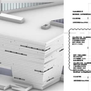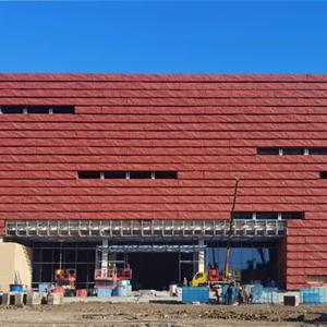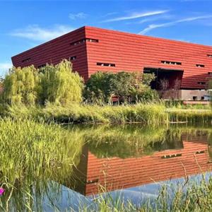 在设计思路上,建筑主体外墙采用GRC(玻璃纤维增强混凝土)材料,单板规格为6000×900mm,通过背栓式干挂系统安装;立面以砖红色为主色调,横向排布强化造型张力,表面辅以粗糙质感的肌理,呼应“奉献、艰苦、奋进”的军垦历史主题。建筑底部体量及广场铺装选用黄色砂岩,其质感与色彩同周边山体地貌自然融合,隐喻建筑从大地中“生长”而出,亦象征兵团军垦文化扎根边疆、生生不息的精神脉络。